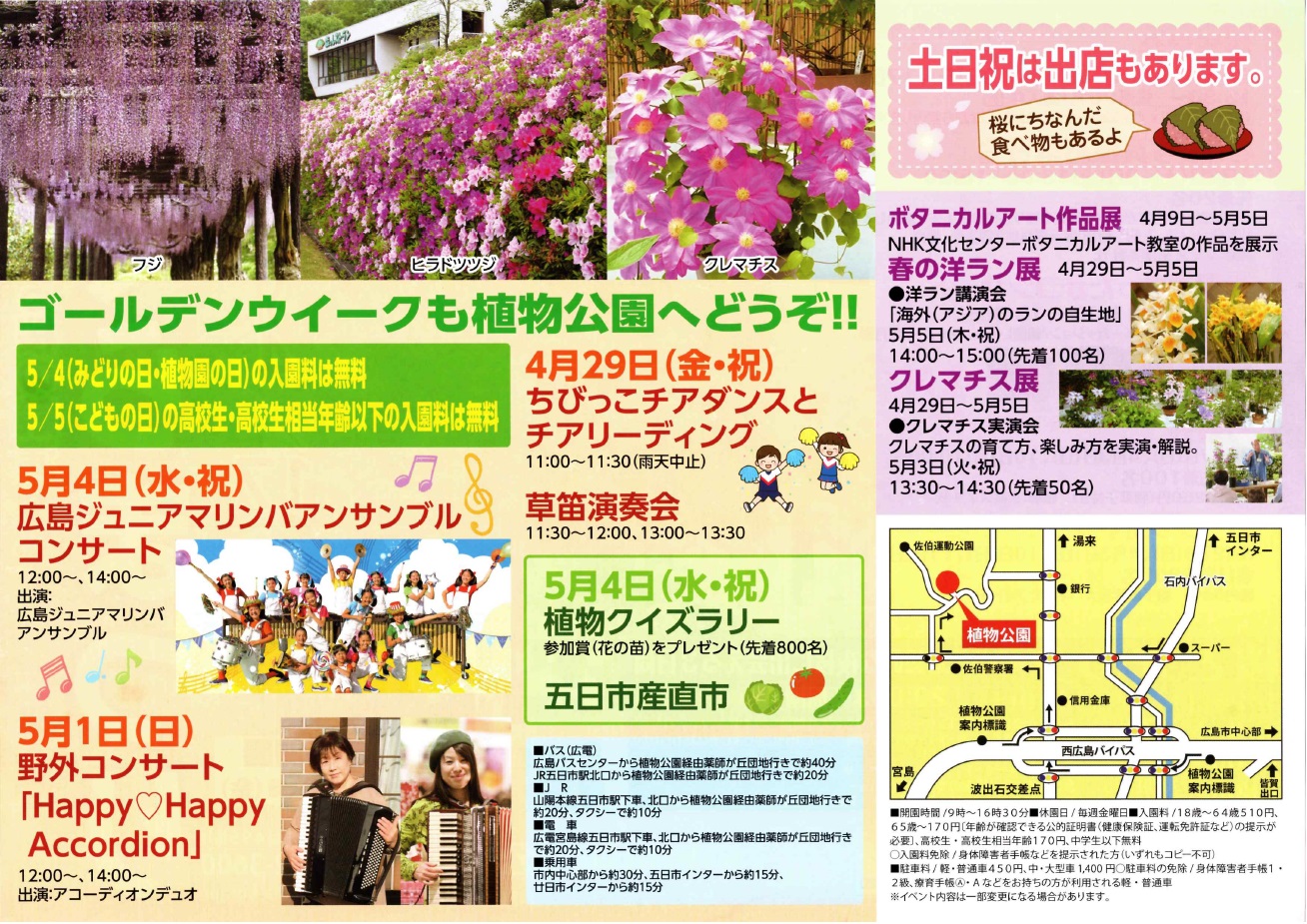 みどりの日・植物園の日記念行事 「広島ジュニアマリンバアンサンブルコンサート」 ※5/4の日は入園料無料(駐車場は有料) ![]() |