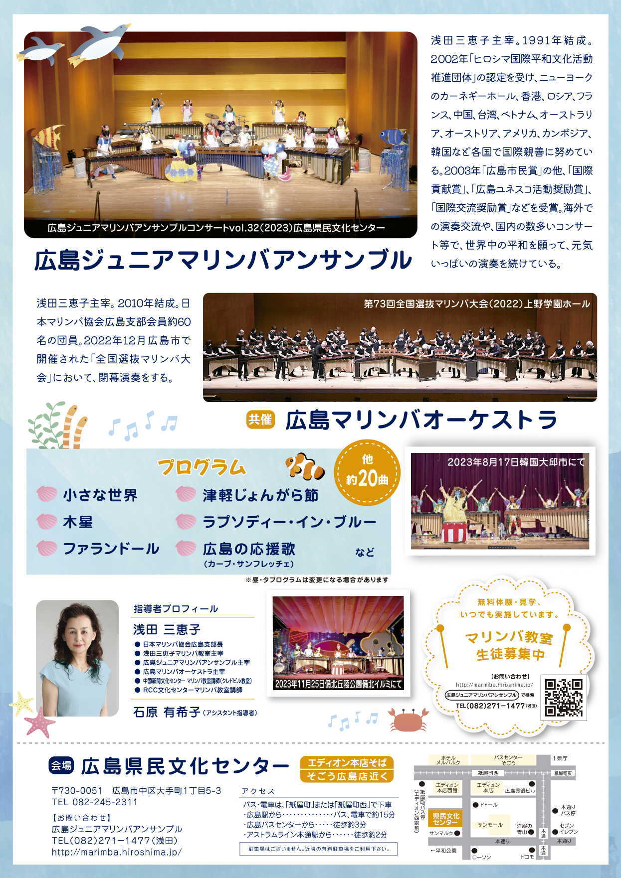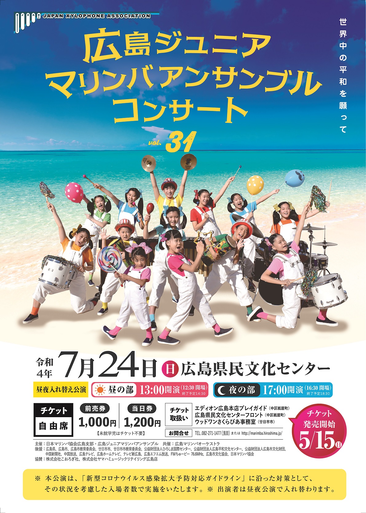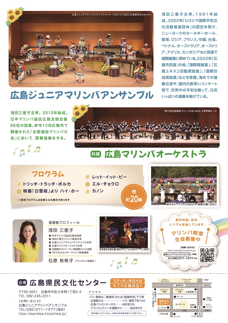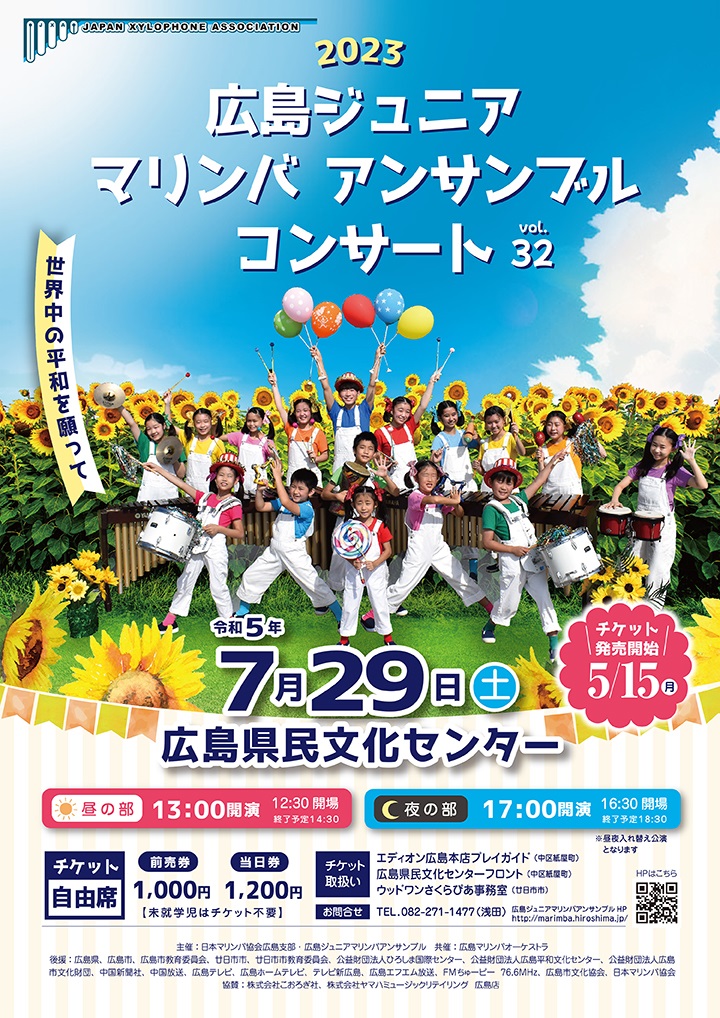 広島ジュニアマリンバアンサンブルコンサートVOL.31 チケット 全席自由 前売券1,000円、当日券1,200円(未就学児チケット不要) チケット発売 5/15(日)〜 ![]() |