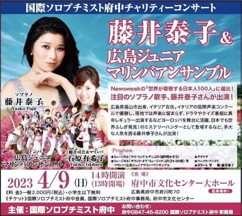 国際ソロプチミスト府中チャリティーコンサート 藤井泰子&広島ジュニアマリンバアンサンブル 入場料: 全席自由 一般 2000円(税込) 小学生以下無料 ![]() |