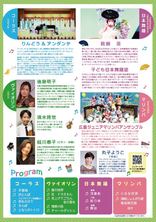 親子でいっしょに 笑顔いっぱいコンサートV 入場無料 参加ご希望の方は各広島市区民文化センターに置いてある整理券をお持ちください。 (整理券がなくても入場できます) ![]() |