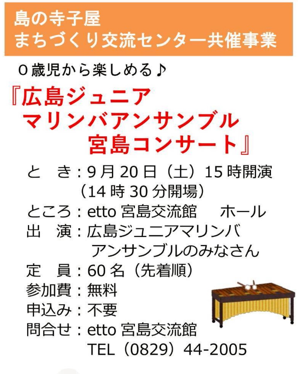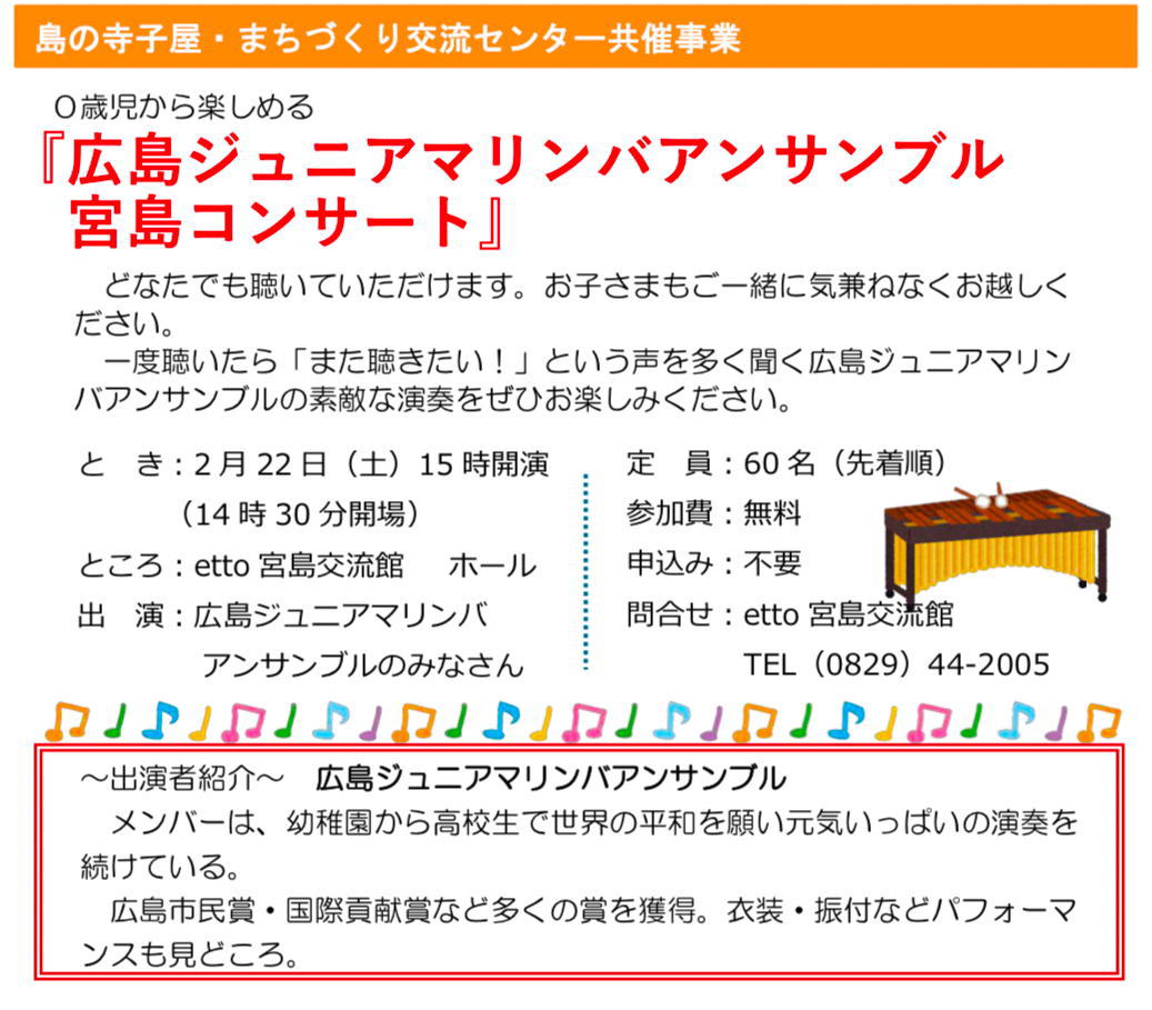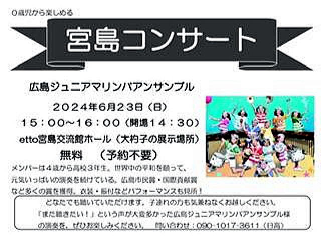 | 2025年 9月20日(土) | 15:00〜16:00 | 『0歳から楽しめる宮島コンサート』 ※入場無料・予約不要 ![]() |