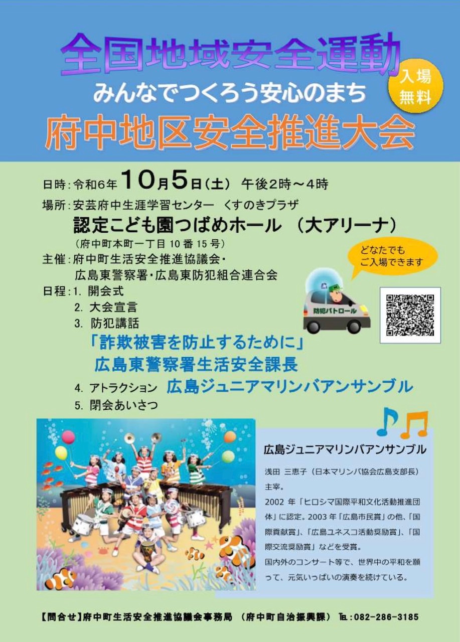 府中南公民館 開館60周年記念式典・記念コンサート 〜記念コンサート 出演・広島ジュニアマリンバアンサンブル〜 参加: 一般募集で先着順140人 申込は10月11日(火)午前9時から、電話または来館で。 (お問い合わせ・お申込み: 府中南公民館 082-286-3277) ![]() |