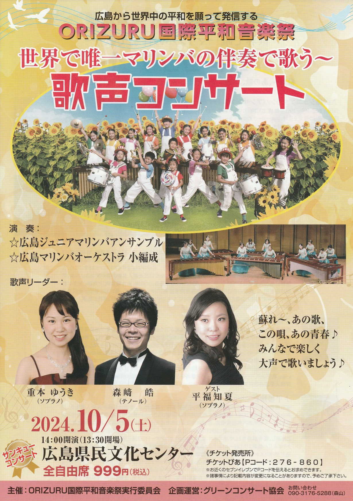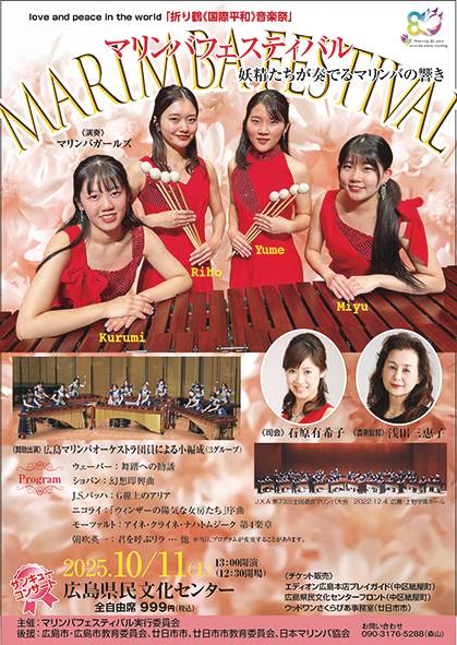 ※※こちらは、マリンバガールズ(OG)の演奏です※※ 「折り鶴《国際平和》音楽祭」 マリンバフェスティバル 全自由席 999円(税込) ![]() |
