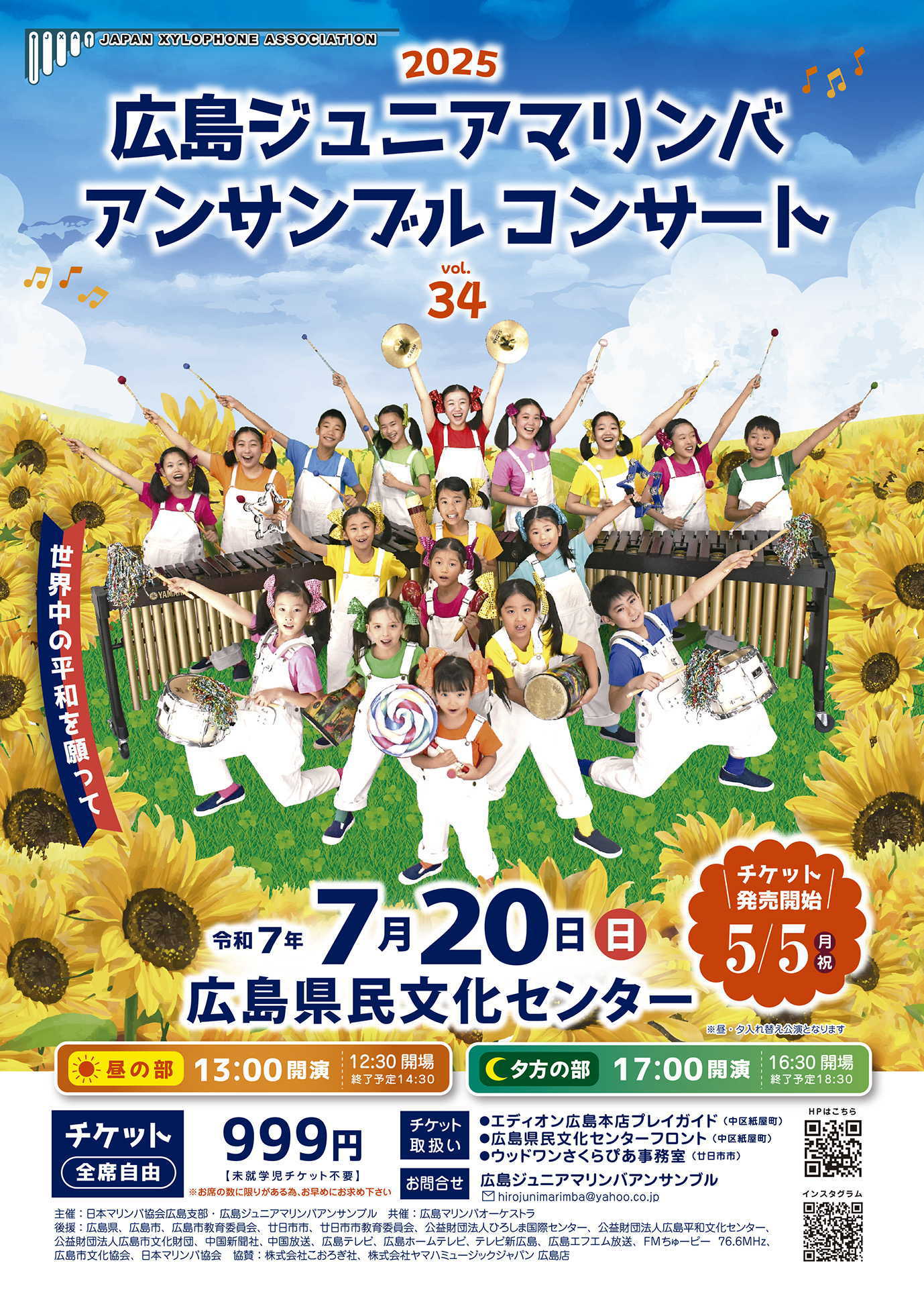 2025 広島ジュニアマリンバアンサンブルコンサートvol.34 <チケット> 999円 ※全席自由 ※未就学児チケット不要 ※チケット発売開始:5月5日(月・祝) <チケット取扱い> ●エディオン広島本店プレイガイド(中区紙屋町) ●広島県民文化センターフロント(中区紙屋町) ●ウッドワンさくらぴあ事務室(廿日市市) ※その他、「@御住所A御名前B必要チケット枚数(どちらの部かもお知らせ下さい)」をメールにてご連絡頂きましたら、郵便(元払い)にて郵送も可能です ![]() |