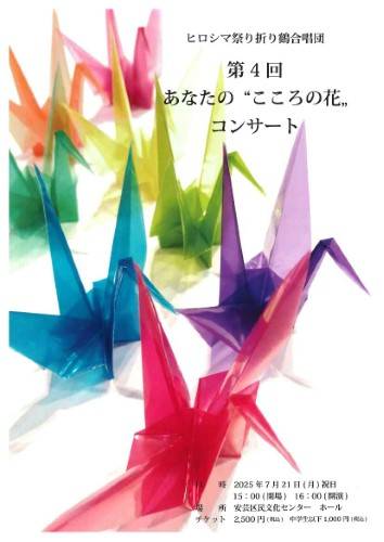 ヒロシマ祭り折り鶴合唱団 第一回 あなたの”こころの花”コンサート チケット・・ 全席自由 2,500円(税込) 中学生以下 1,000円(税込) チケット販売/ヒロシマ祭り折り鶴合唱団事務局 お問い合わせ 082-888-7740(ヤマネ) ![]() |