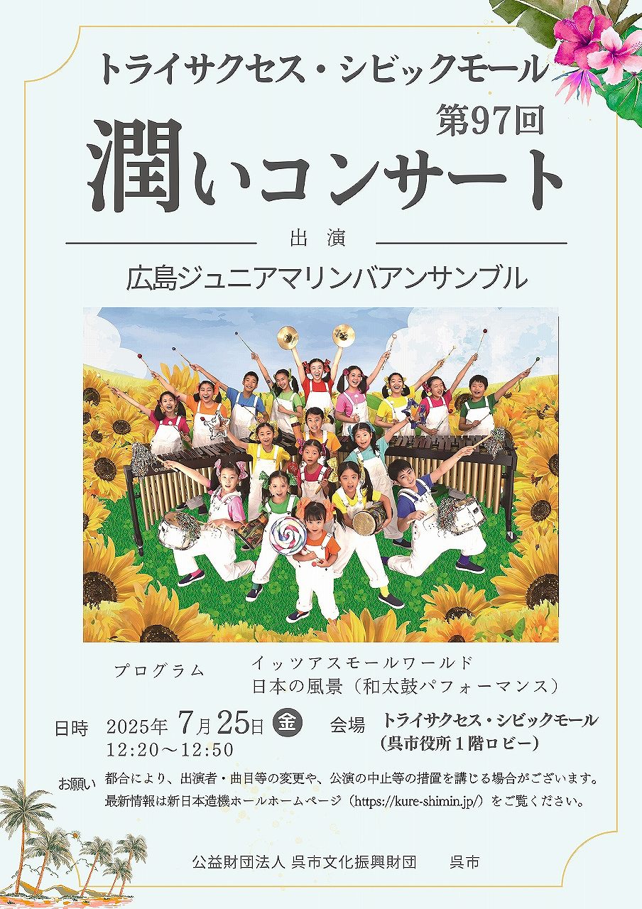 | 2025年 7月25日(金) | 12:20〜12:50 | 第97回 潤いコンサート ※入場無料 ※詳細は以下ページにてご確認ください https://www.kure-shimin.jp ![]() |