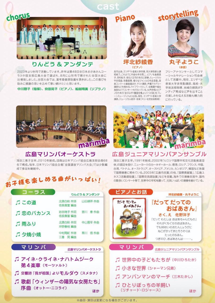 | 2023年 6月18日(日) | 10:40〜11:40 | 音楽鑑賞会(広島ジュニアマリンバアンサンブル) ※関係者以外入場できません |