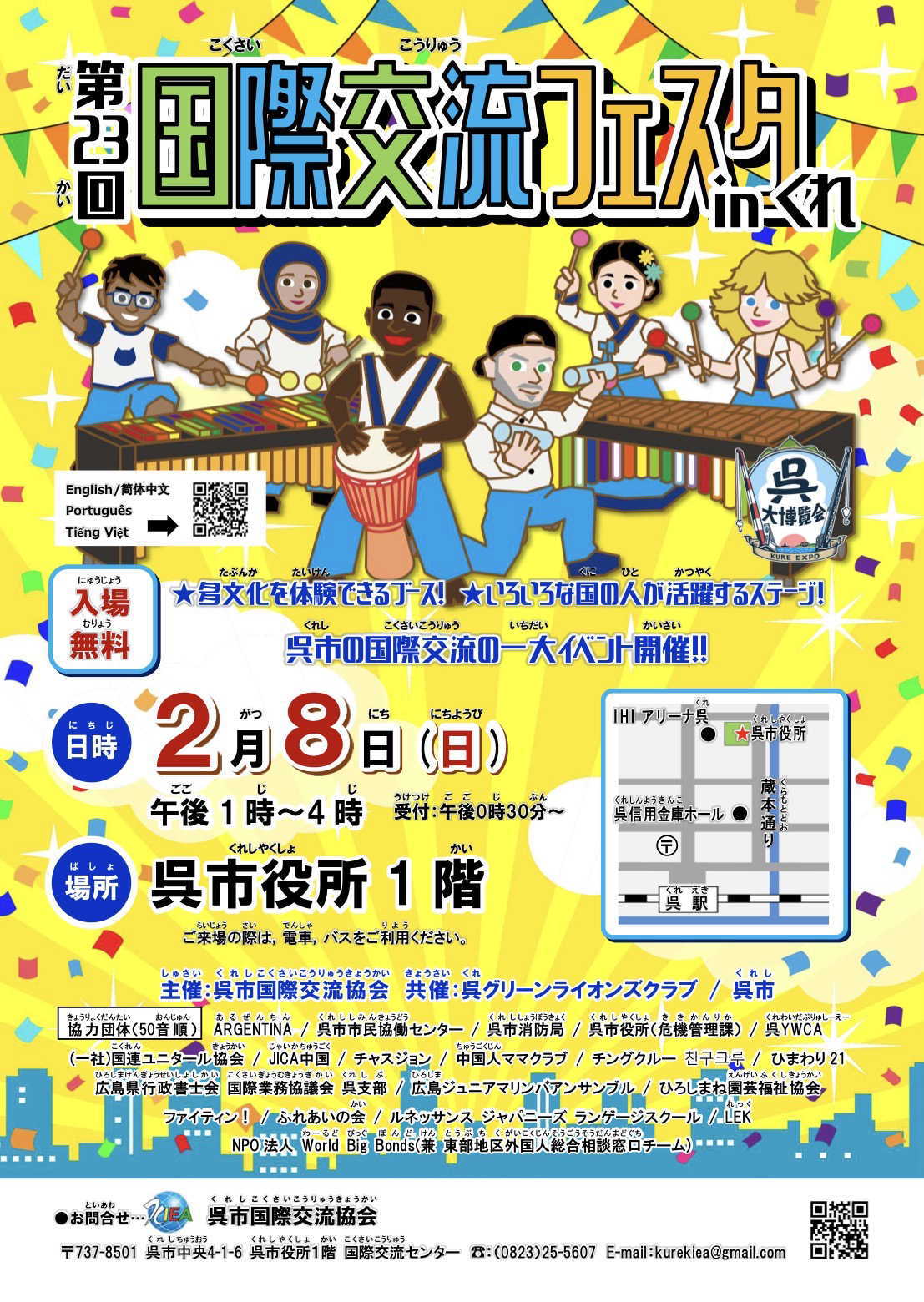 | 2026年2月8日 (日) | 14:50〜15:30 | 第23回 国際交流フェスタinくれ 入場無料 ![]() |