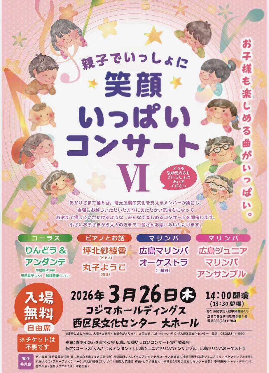 親子でいっしょに 笑顔いっぱいコンサートV 入場無料 参加ご希望の方は各広島市区民文化センターに置いてある整理券をお持ちください。 (整理券がなくても入場できます) ![]() |